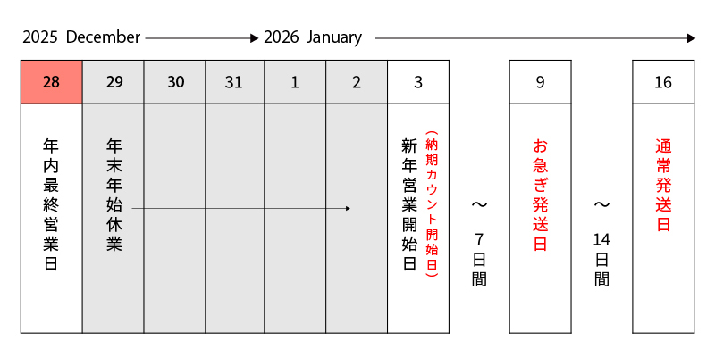 ※オンラインショップの発送業務は12/28までとなります。 年末年始休業中にお申込みいただいたご注文の納期は、1/3よりカウントをさせて制作させていただきます。 ご不便をお掛けいたしますがご理解のほど、何卒よろしくお願い申し上げます。