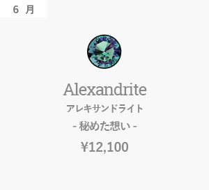 ロシア皇帝だったニコライ1 世への献上品として贈られ、当時皇太子であったアレクサンドル2世の誕生日にちなみ“アレキサンドライト”と名付けられた。 当たる光によって石の色が変わることにより【危険が近づくと色を変えて教えてくれる石】と言われ、現在も危険回避の石として好まれております。